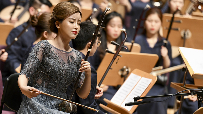 下半場(chǎng)則集中了三部氣勢(shì)磅礴的民族管弦樂(lè)作品:賈國(guó)平的《盤(pán)古》訴說(shuō)了生活在華夏大地的先祖不畏艱險(xiǎn)、征服自然的氣魄;蘇瀟的《烽火》獻(xiàn)禮新中國(guó)成立70周年,用二胡與樂(lè)隊(duì)來(lái)表現(xiàn)戰(zhàn)火后重生的中國(guó);王建民的《大歌》受侗族大歌的強(qiáng)烈印象與感染力而作,描繪了侗族大歌的絢麗音響及山寨歡歌載舞的場(chǎng)景。