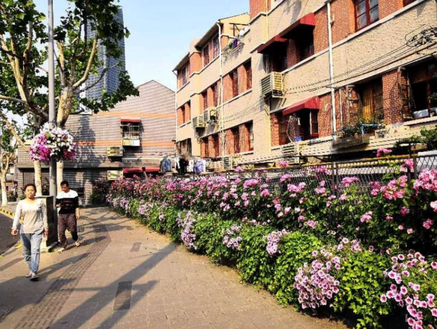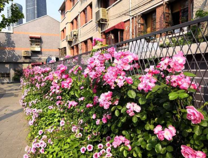 據介紹,這次東長治路“花街”的打造,虹口區綠化市容局可謂見縫插針,能開挖的做花槽種植藤本月季,沒有開挖條件的,設置特別定制的爬藤隔離花箱。同時,區綠化市容局對機動車道中央隔離帶開挖種植槽、增量增色工地圍墻外立面綠化和綠化帶,將沿街綠化連點成線,形成一條串聯特色街區的多彩花帶,打造北外灘精致高雅、開放現代、大氣進取的景觀風貌。