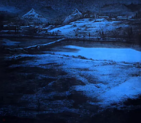 作為李可染先生的再傳直系弟子,趙玉祥嚴格遵循可染先生關于對待傳統的態度。一個畫家的地位,來自于他對傳統的領悟和樹立自己獨特的風格,更在于他作品風格的多元化。趙玉祥除了萬山紅遍風格之外,眾所周知的是他的《月光》、《除夕之夜》、《古鎮》等藍色系列。萬山紅遍是熱烈蓬勃的暖色調,藍色系列是冷色調,說的簡單一點,后者是法國印象主義大畫家德加的藍色調。但是《除夕之夜》系列的冷色調表現的夜景并不是陰暗冰冷的,而是陰沉夜色中有蒼茫的深厚,夜色的雪景中民居透漏出點點微光,這是對貴州鄉間世世代代純樸生活的細致描繪和歌頌。