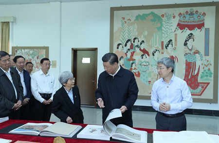 8月19日,中共中央總書記、國家主席、中央軍委主席習近平來到敦煌研究院,察看珍藏文物和學術成果展示,并同有關專家、學者和文化單位代表座談。 新華社記者 鞠鵬 攝