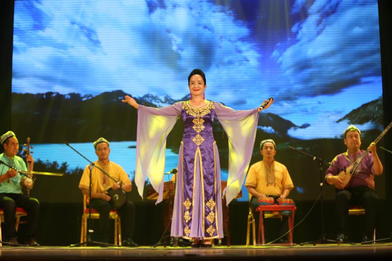 《美麗莎車》《烏茲別克姑娘》《花兒為什么這樣紅》等精彩的民族歌舞引得上海觀眾的陣陣掌聲。尤其是民族器樂(lè)演奏,既有獨(dú)特的民族音樂(lè),也有《上海灘》等上海觀眾耳熟能詳?shù)那?。尤其最后的《我和我的祖?guó)》,臺(tái)上臺(tái)下互動(dòng)合唱,氣氛熱烈,共祝祖國(guó)繁榮昌盛,把演出推向高潮。