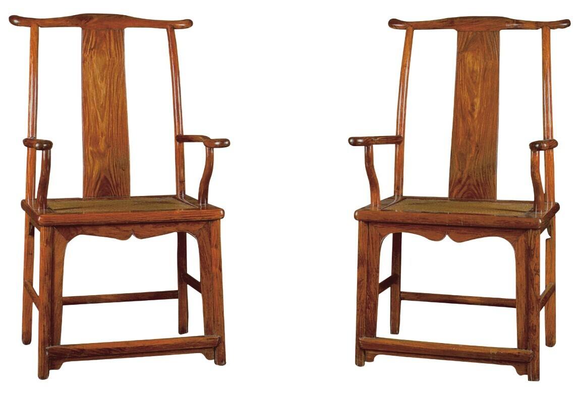 造型少見。為一木而刻出三段相接之狀,折轉有力。靠背板平直寬厚,正中嵌雞翅木板。椅盤下裝素面刀牙板,腿間設步步高趕棖,正面腳踏下裝素牙條。