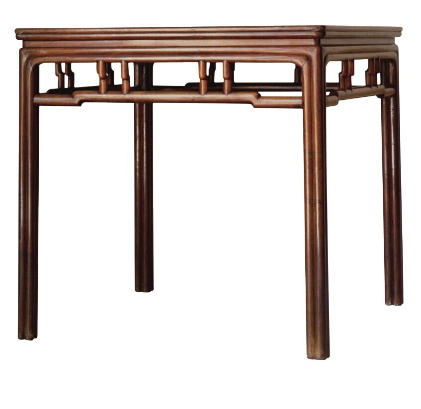 桌面以格角榫造法攢邊,打槽平面鑲獨板面心,下裝兩根穿帶出梢支承,另有相交穿帶加強承托。抹邊立面起雙混面。形狀相似的牙條與束腰為一木連造,以抱肩榫與劈料腿足結合。牙條與羅鍋棖之間栽入四根格肩竹節形矮老。此桌子設計受竹質或藤編家具影響,當時此種以珍貴木材仿制一般到處可見的竹材或藤編家具,想必是反映文人內斂不求外炫的心態。