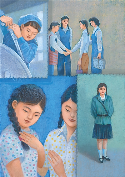 20世紀(jì)50年代,我們這個(gè)年輕的國(guó)家正在起步,當(dāng)時(shí)流行蘇式服裝,以藍(lán)、黑、灰為主,款式也很簡(jiǎn)單。這幅畫中主要突出的是質(zhì)樸的整體氛圍。那時(shí)的穿衣以簡(jiǎn)單實(shí)用為主,衣著風(fēng)格流露出親切、自然的氣息。