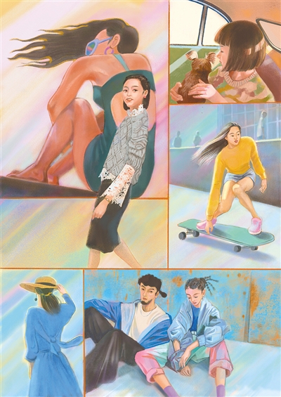新中國(guó)成立70年來,我國(guó)的服裝風(fēng)格經(jīng)歷了從單一到豐富、從嚴(yán)肅到活潑的過程,表現(xiàn)出了中國(guó)人對(duì)美好生活的向往。服裝是一種記憶,也是一種語言,它的變化以圖像和實(shí)物的方式記錄著經(jīng)濟(jì)、社會(huì)及文化的歷史變遷。通過資料的整理,我發(fā)現(xiàn)很難僅僅用一個(gè)畫面來詮釋服裝變化。于是我想通過繪畫創(chuàng)作中的格狀構(gòu)圖,也就是類似漫畫畫格的方式來表現(xiàn)。畫面主要是把各個(gè)時(shí)期的縮影用片段式的語言表達(dá)出來,服裝、人物的表情和動(dòng)作以及整體的色彩等元素,構(gòu)成了一個(gè)個(gè)不同時(shí)期的氛圍。