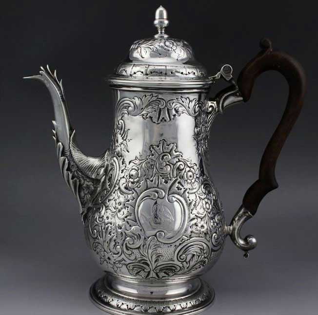 英國(guó)倫敦 年代:1768年(清朝乾隆三十三年) 標(biāo)記:純銀行走獅子標(biāo)+產(chǎn)地標(biāo)(戴皇冠的美洲豹頭)+年代標(biāo)(N)+工匠標(biāo)(T.W) 重量:845克 尺寸:高24厘米,腹部直徑22厘米 喬治三世早期的銀壺,將近250年的歷史,產(chǎn)地標(biāo)是帶皇冠的美洲豹頭,是倫敦早期的產(chǎn)地標(biāo),工藝精湛,壺身是滿(mǎn)工浮雕花葉紋,高圈足,器體造型、花紋的樣式和裝飾技法都是典型的英國(guó)18世紀(jì)中期風(fēng)格