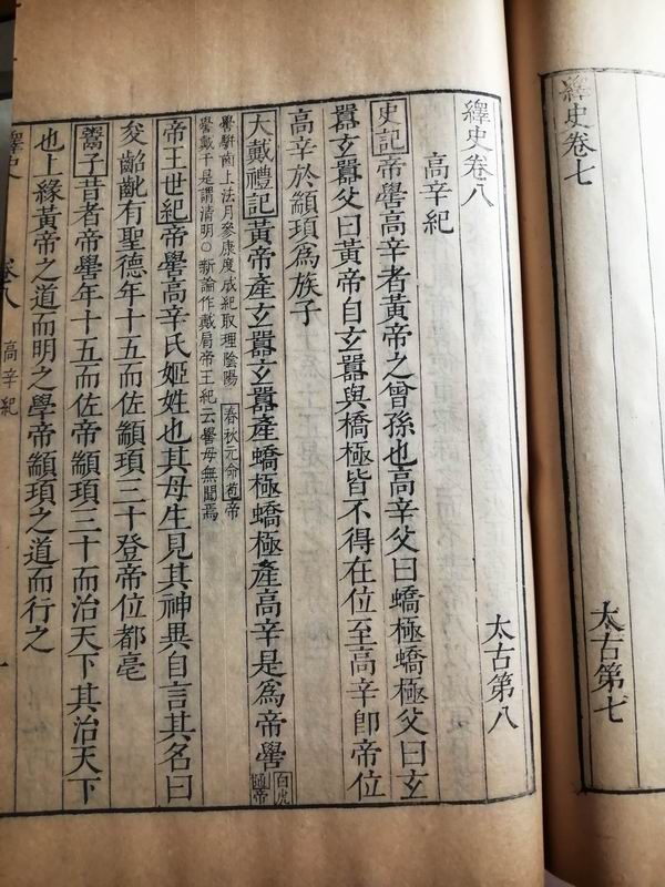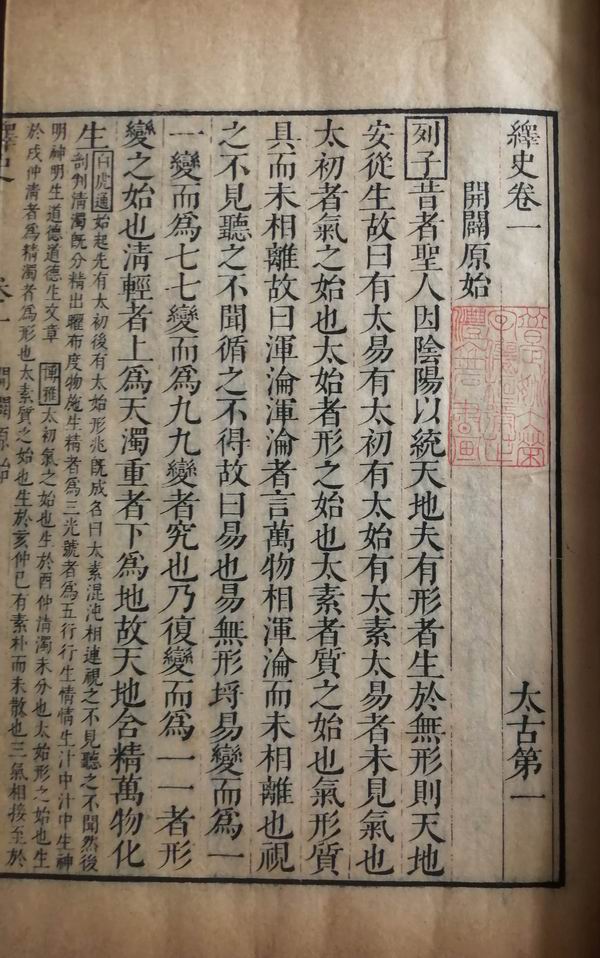 《繹史》書版入內府后又有所剜改,由于書成之后的靈璧初印本流傳極為罕見,知者不多。據《伯克萊加州大學東亞圖書館中文古籍善本書志》記載,原刻初印本卷八首頁的“自玄囂與橋極皆不得於位”,剜改后印本已改“橋”為“蟜”。康熙原刻本與清末翻刻本相比,也有所不同。比如卷一首頁第十一行“太初,氣之始也,生於酉仲”,原刻本諸字大小一致,而翻刻本“仲”字略大,頗為突兀。對照上述特征,我所收藏的這部《繹史》無疑就是原刻初印本。查詢二十年來的古籍拍賣紀錄,沒有其他初印本出現,可知此書之罕見難得。